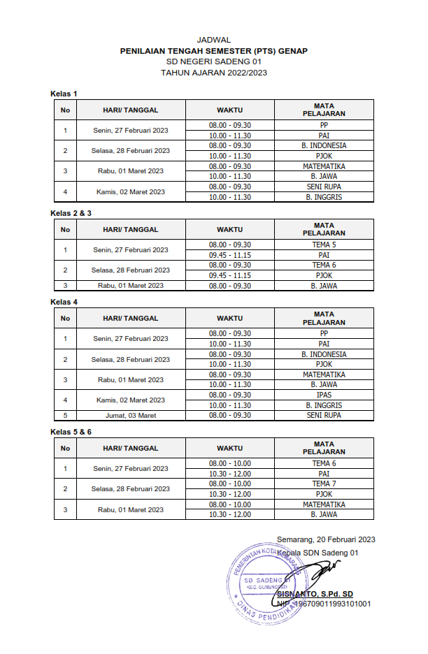 Berdasarkan Keputusan Kepala Sekolah SD Negeri Sadeng 01 Semarang tentang penetapan kalender pendidikan Tahun Ajaran 2022/2023, sekolah akan melaksanakan Penilaian Tengah Semester (PTS) Genap, maka disampaikan hal-hal sebagai berikut: